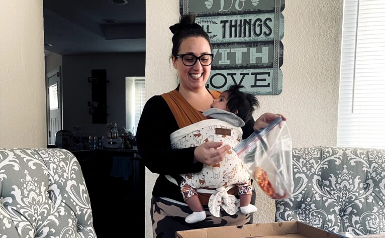 I share a home with my sister, who is my very best friend. We created this space together to be full of joy, laughter, and support. Our home has a big grassy backyard where the kids can run and play, and we love being outside, especially picking fruit from the trees we planted. It’s a happy, welcoming place to grow up, and I feel so lucky to raise my children here.